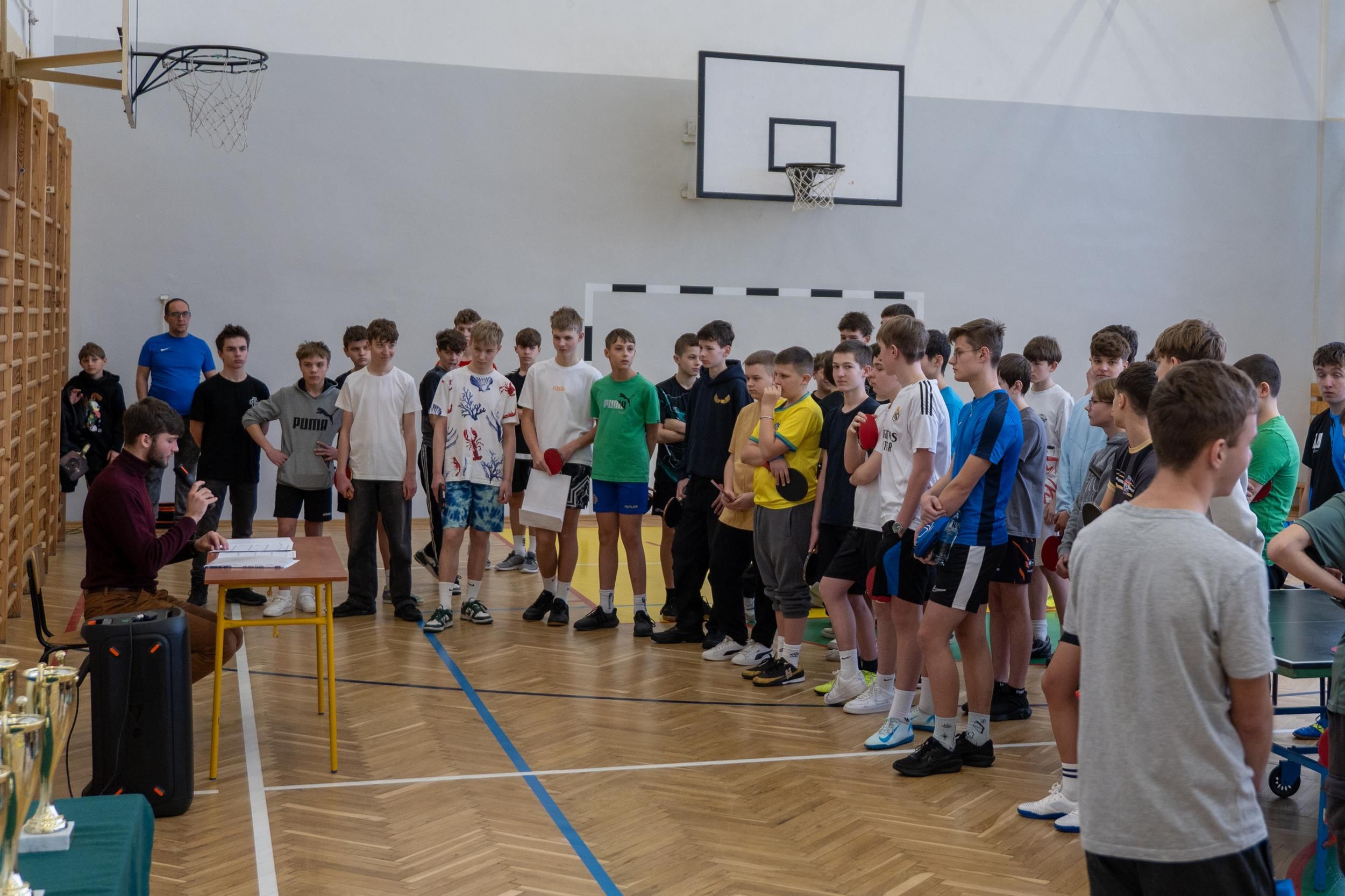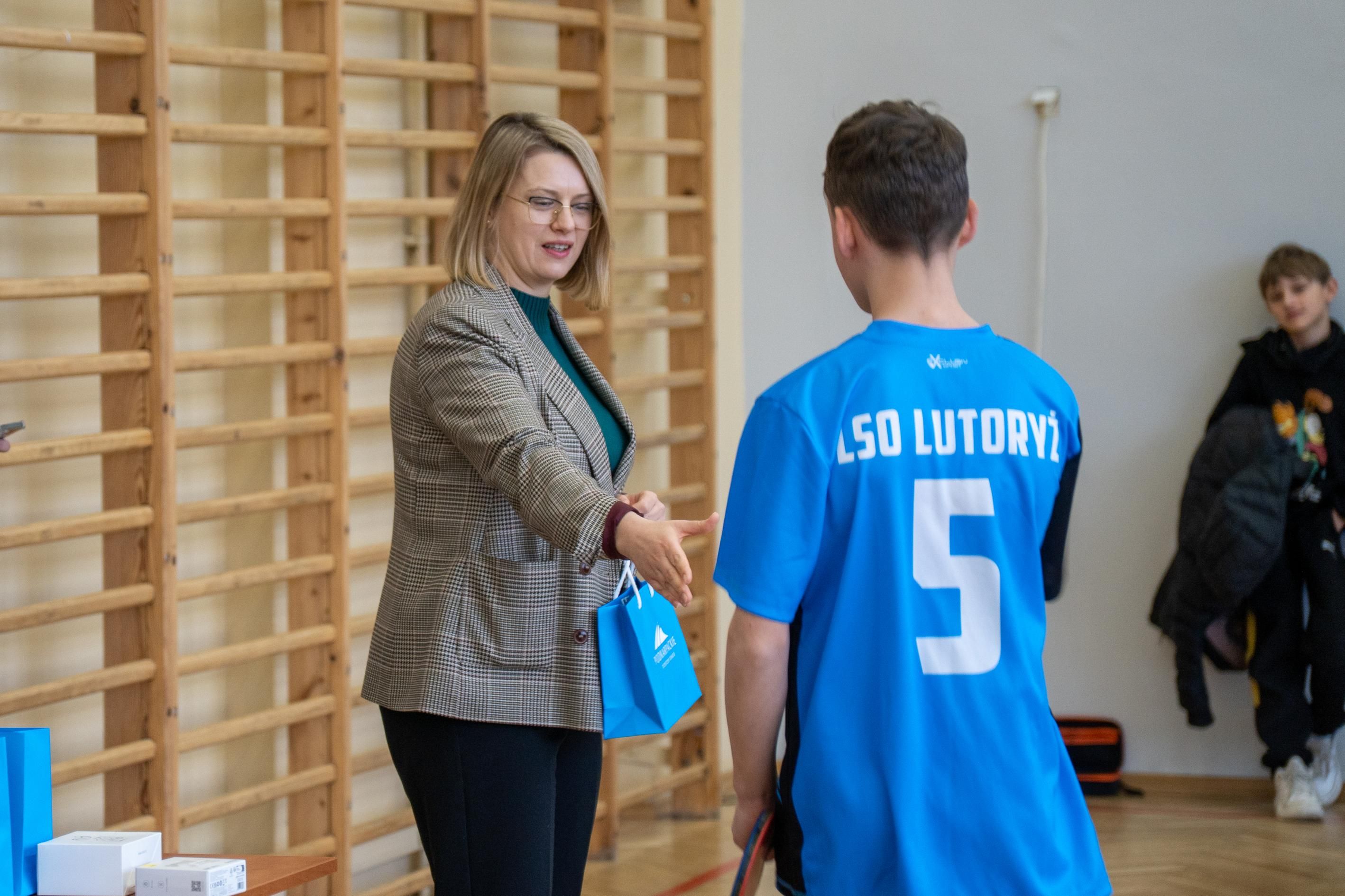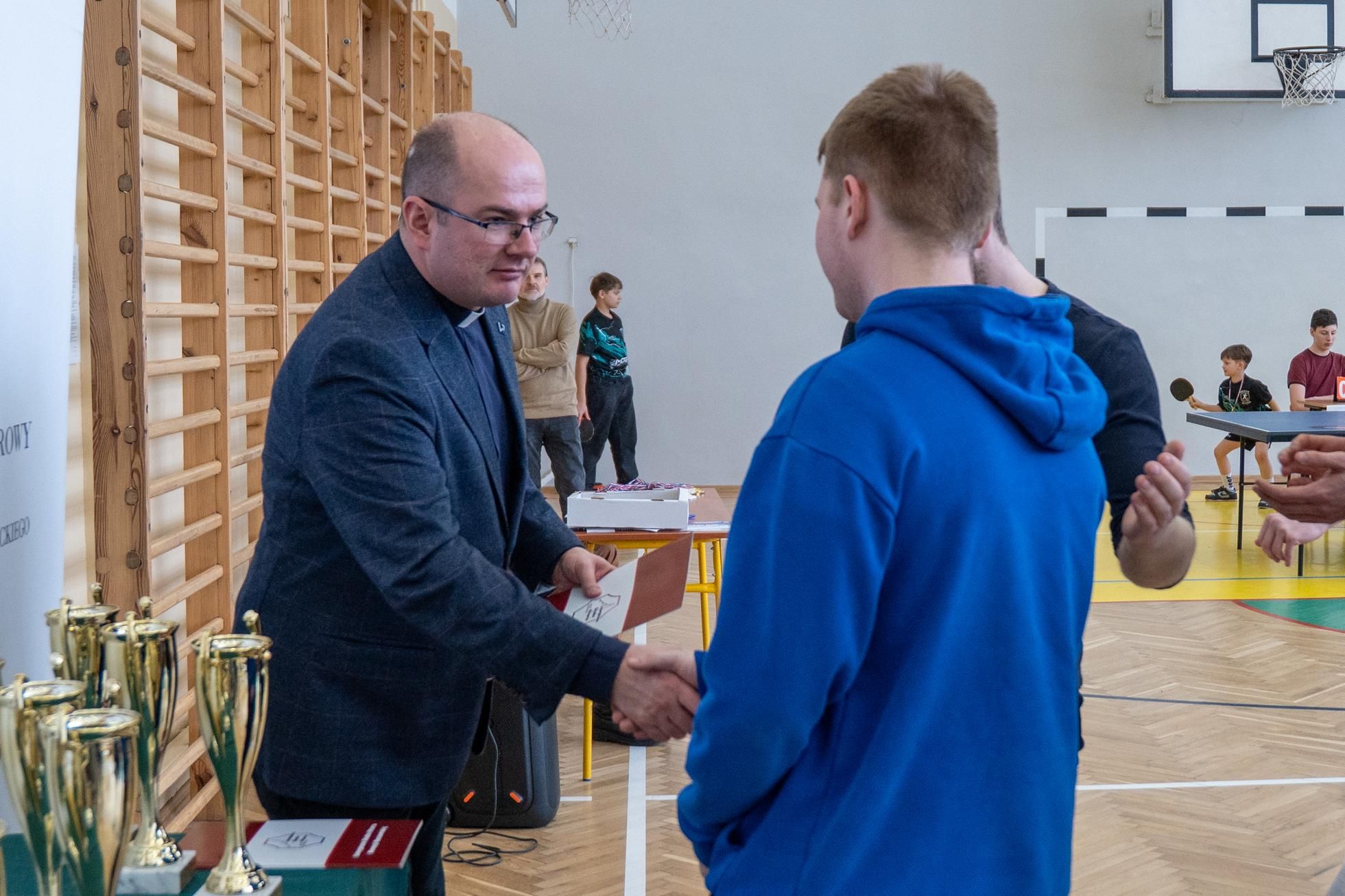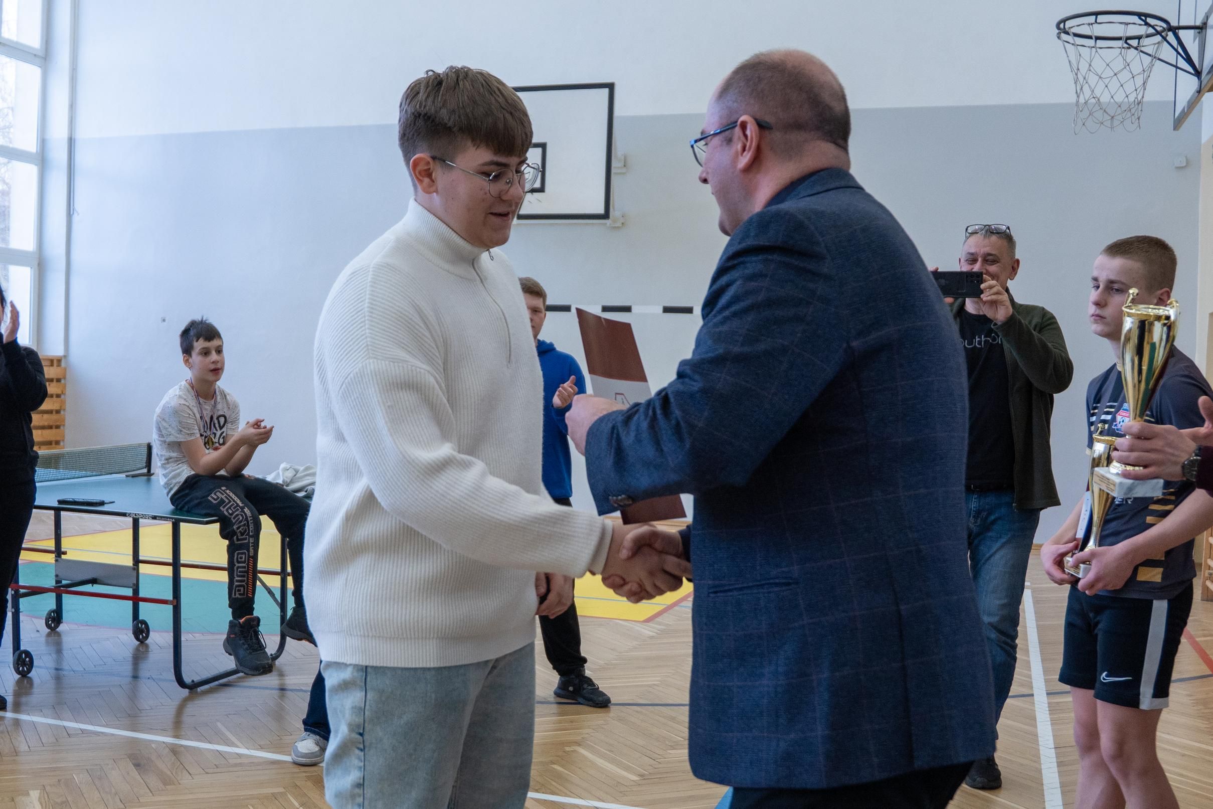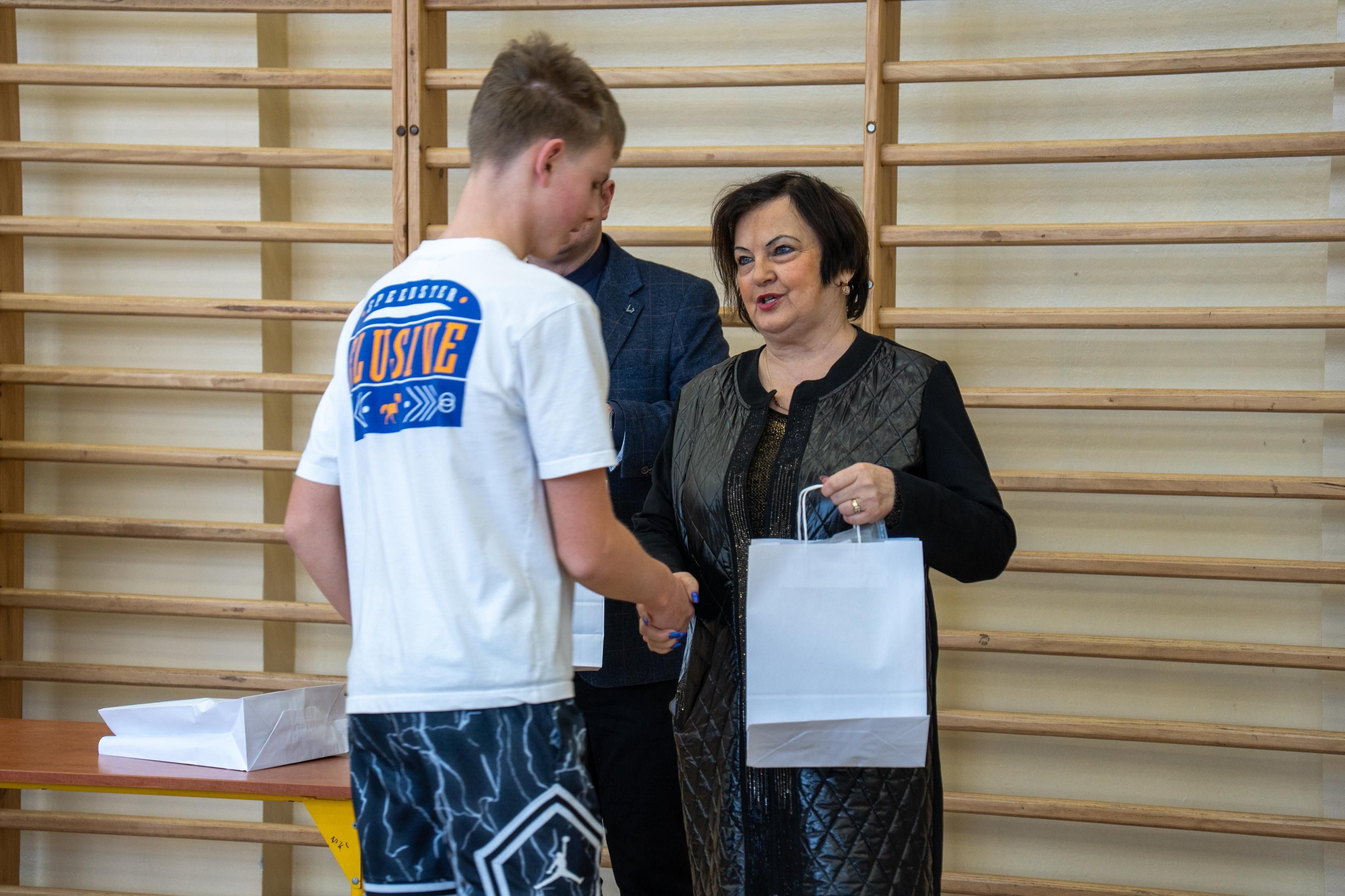 Następnie odbyło się losowanie wartościowych nagród przygotowanych przez panie Katarzynę Sołek oraz Barbarę Tereszkiewicz-Stach. Wśród nagród znalazły się m.in. koszulka Klubu KTS ENEA Siarkopol Tarnobrzeg, zestawy do gry w tenisa stołowego oraz słuchawki bezprzewodowe, które wzbudziły duże zainteresowanie i radość wśród uczestników.