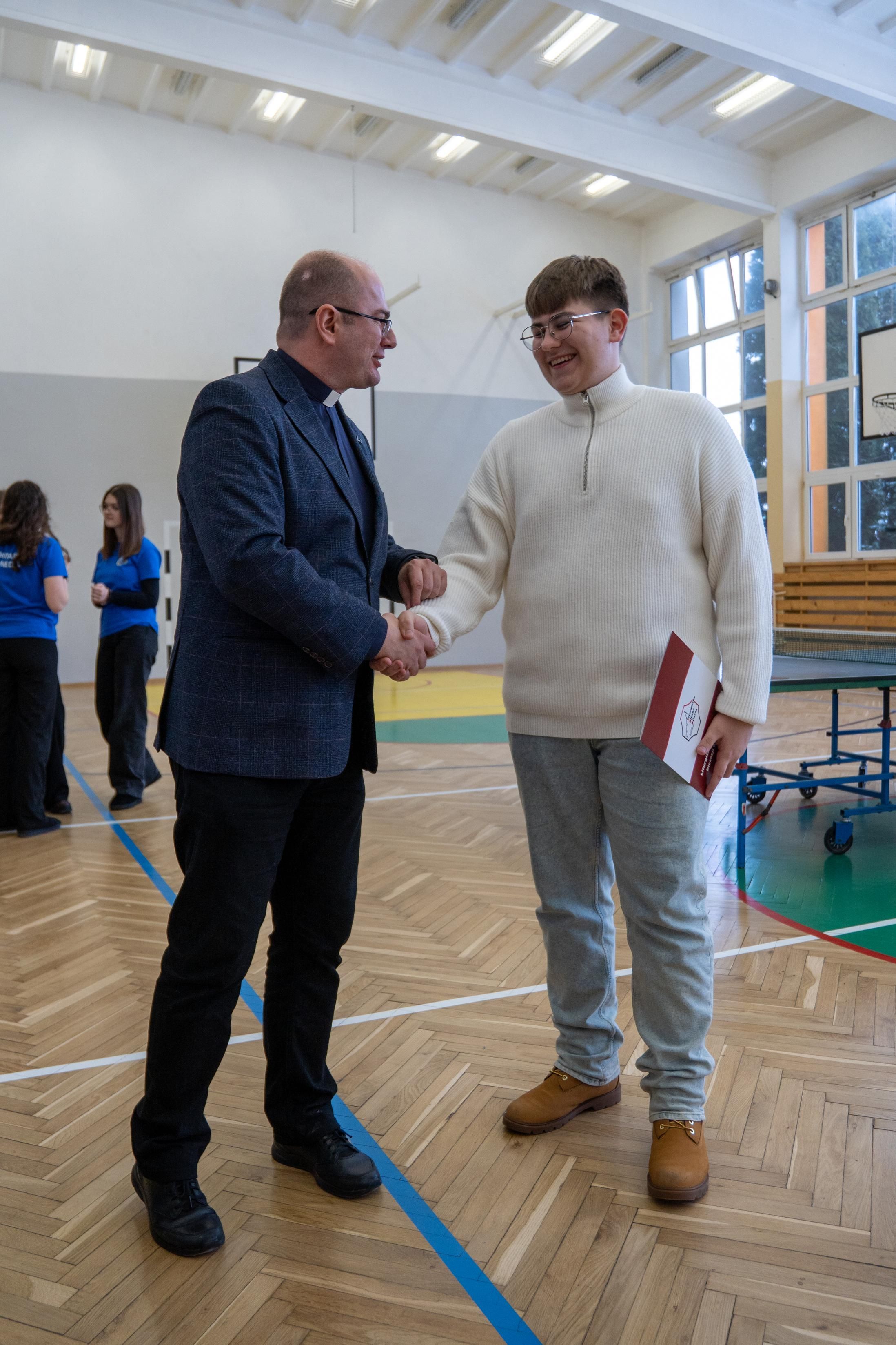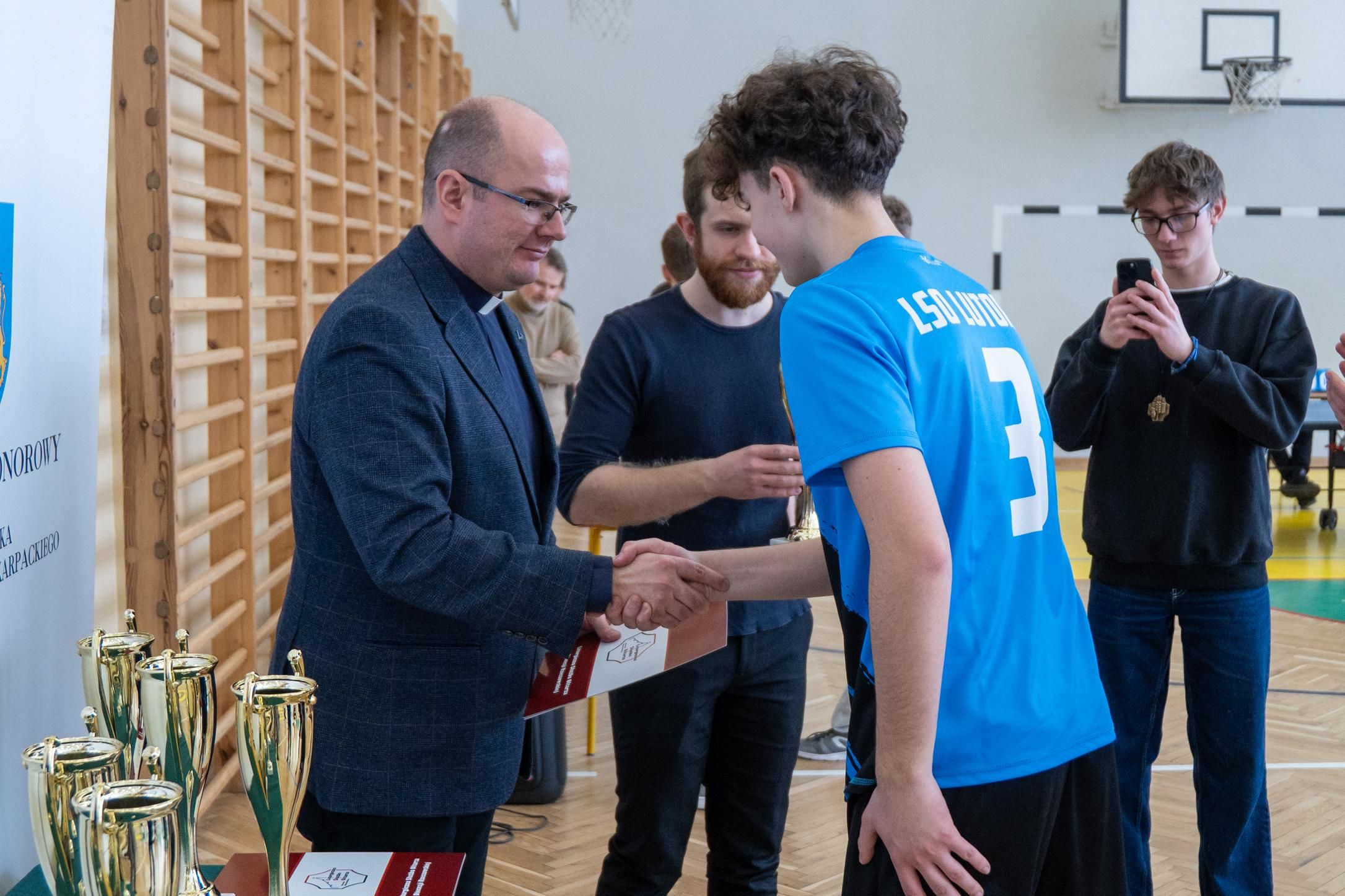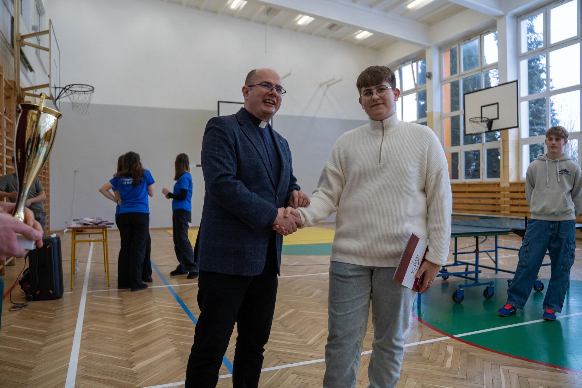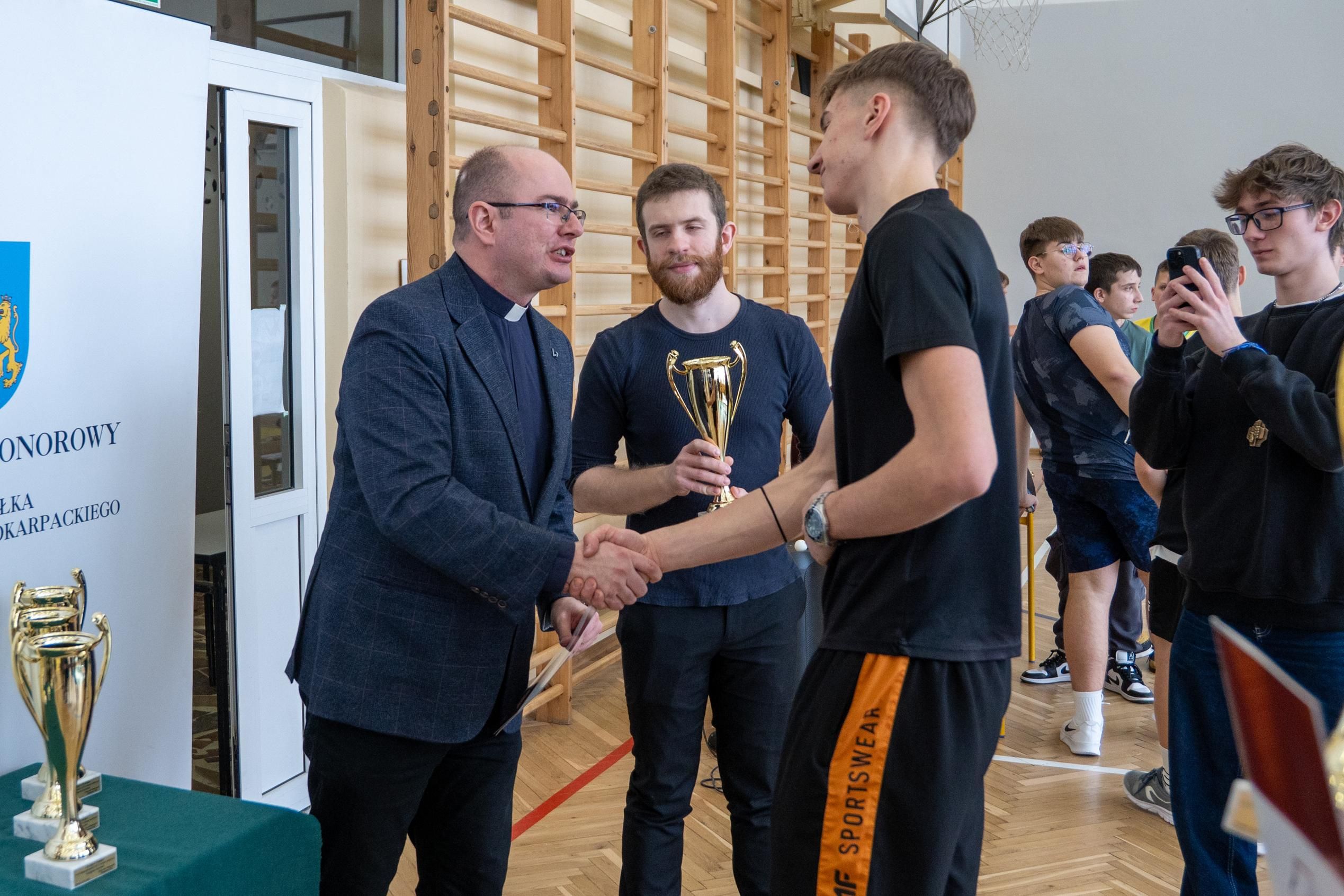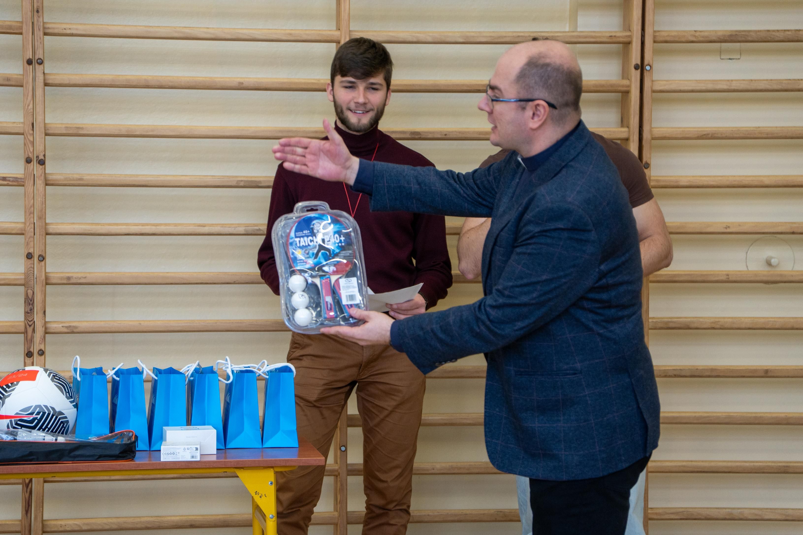 Następnie odbyło się losowanie wartościowych nagród przygotowanych przez panie Katarzynę Sołek oraz Barbarę Tereszkiewicz-Stach. Wśród nagród znalazły się m.in. koszulka Klubu KTS ENEA Siarkopol Tarnobrzeg, zestawy do gry w tenisa stołowego oraz słuchawki bezprzewodowe, które wzbudziły duże zainteresowanie i radość wśród uczestników.